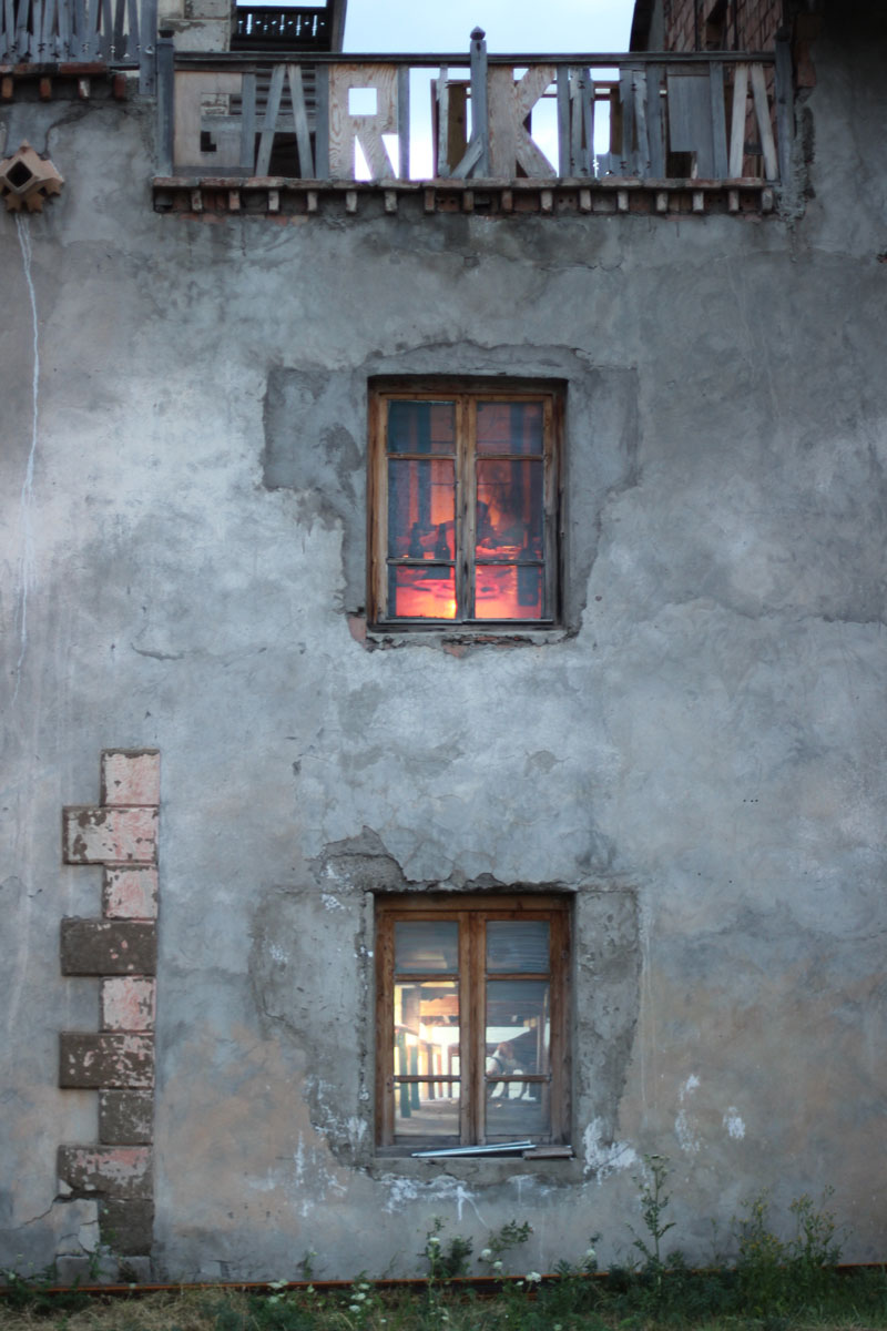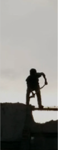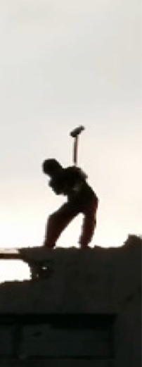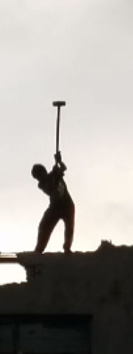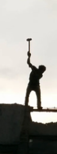 Two construction workers hammer in turn, almost rhythmically onto the face of a building. Their pace is uninterrupted, there are no questions asked. The never-ending loop of construction-deconstruction, distilled in the heavy swings of the two workers on the rooftop of an Indonesian ruin is projected onto the windows of an old Viennese government building.