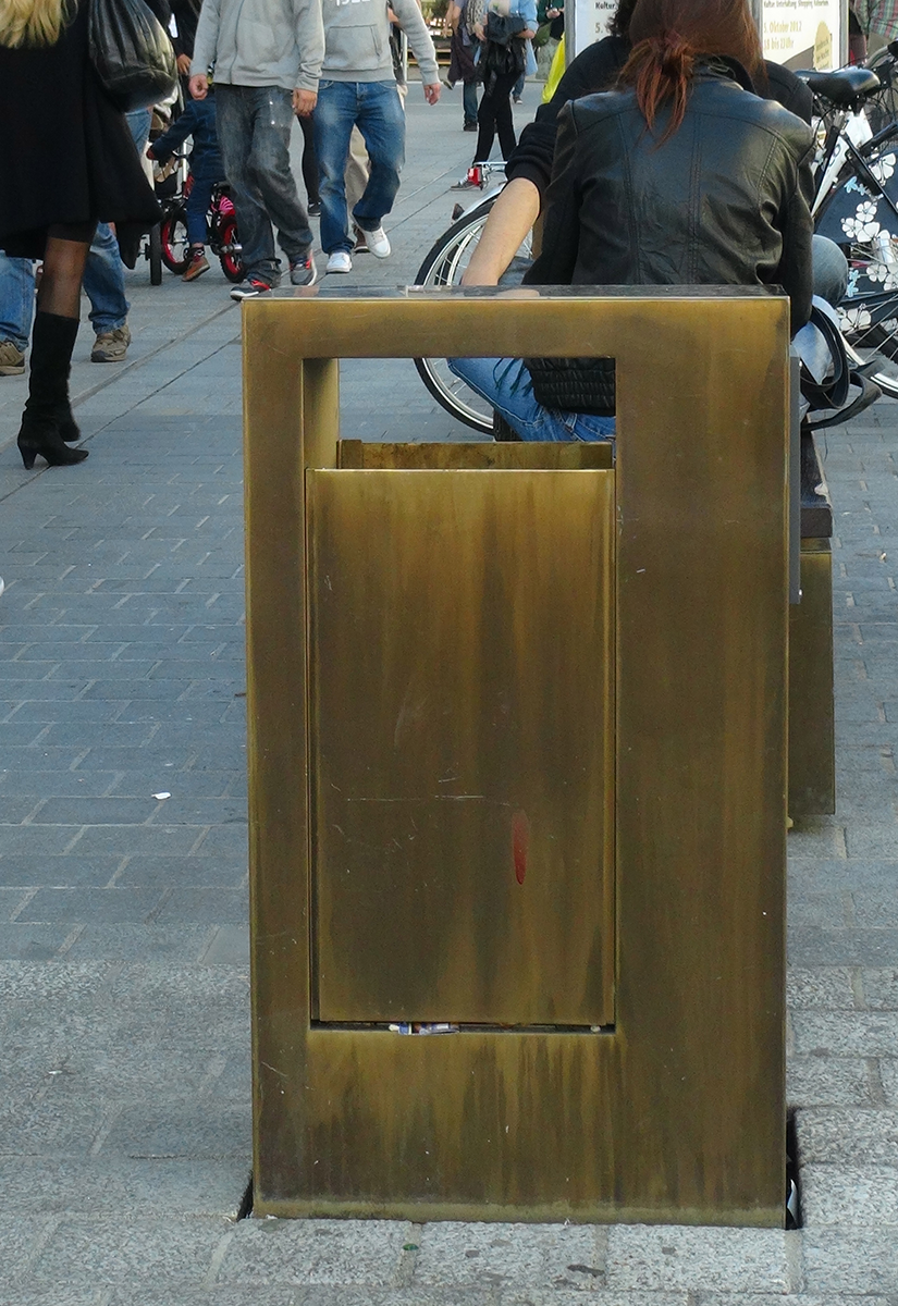 When an object is thrown into the bronze trash can, a sound file is played that imitates the echo of the thrown object. This sound can be compared with the falling of the object into a shaft space. The reverberation suggests a space of great depth, the sound can be dull, bright, or other variations, different every time.