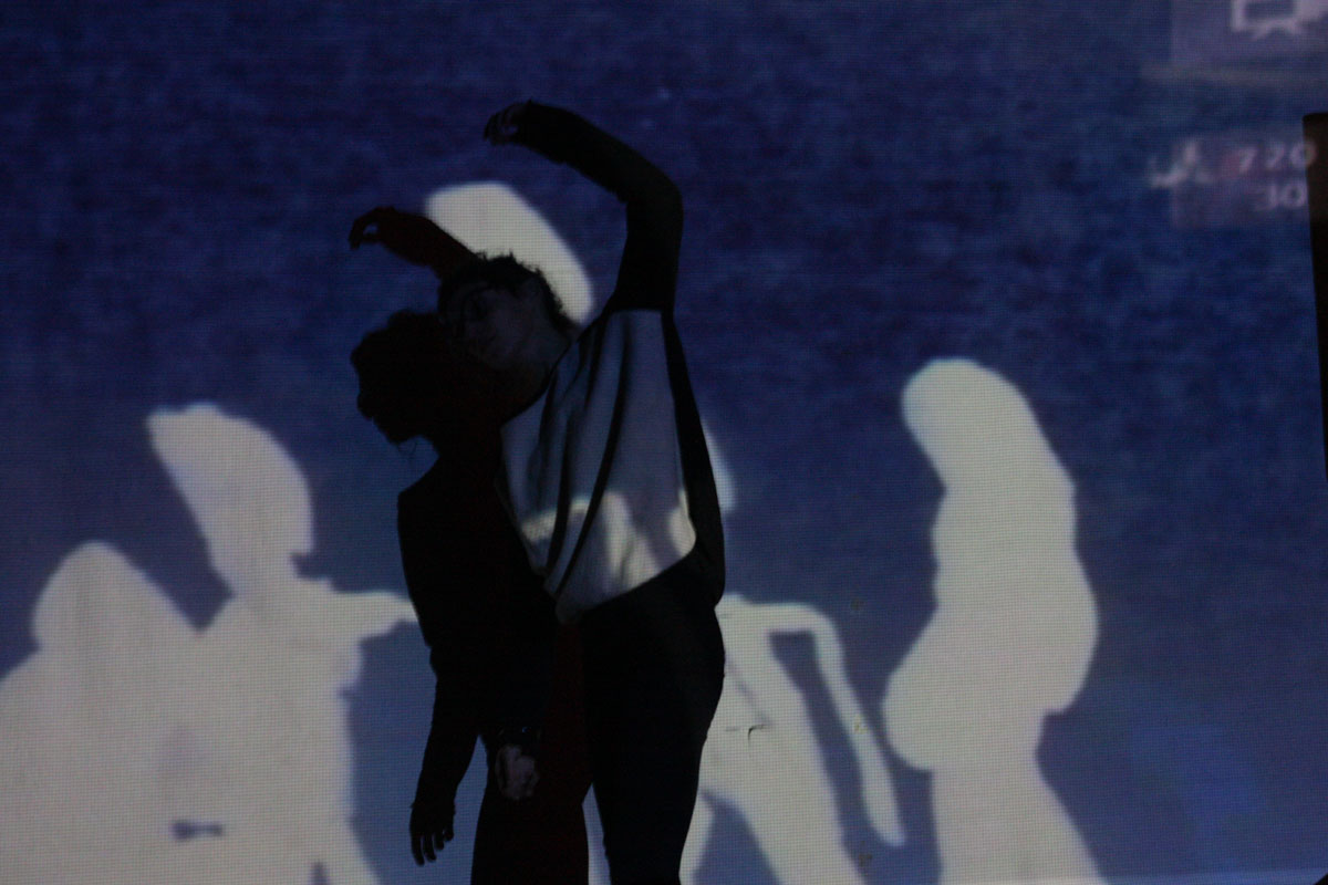 “Prolog#2” is the attempt to draw the silhouette of a performer that is projected onto the person herself and the wall behind her. As the movements become faster the outlines also fade into ever more simplistic strokes and catching up becomes harder.